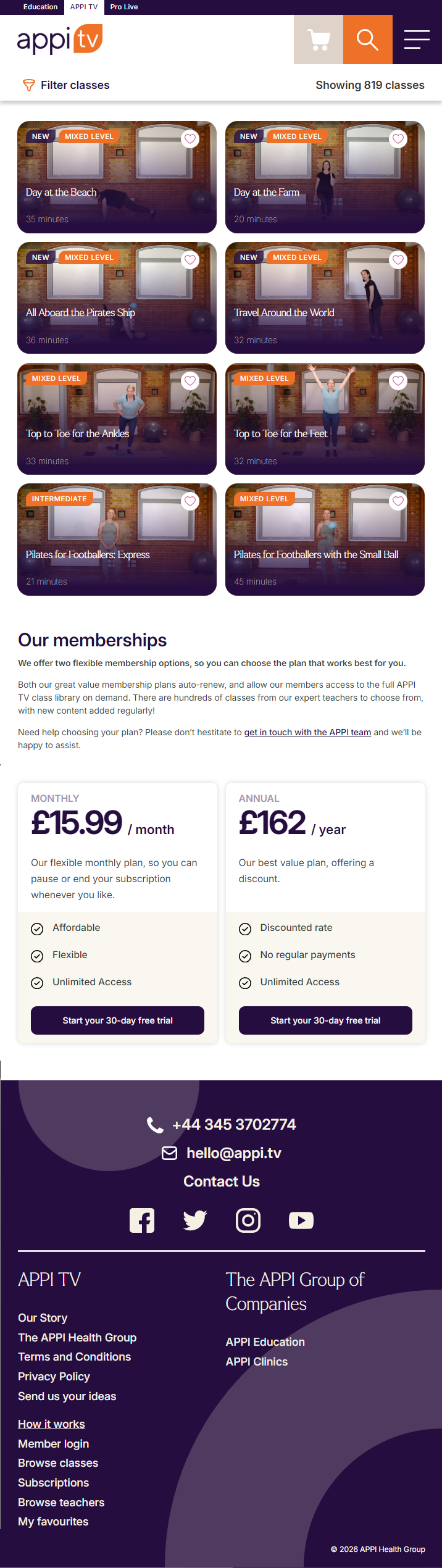 See the resultAPPI TV makes use of a simple subscription model, in which users can select between Pay Monthly and Pay Annually options, to unlock streaming class library content.
